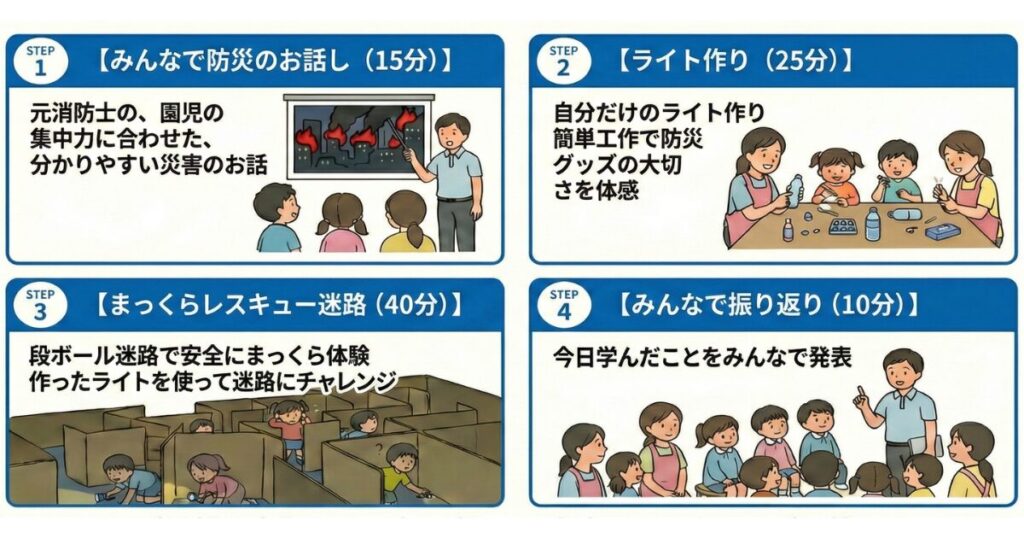 A4: 迷路体験だけではなく、防災のクイズや、体験後の振り返りまで含めて「学び→気づき→行動」に繋げる構成です。園のねらいに合わせて内容は調整できます。